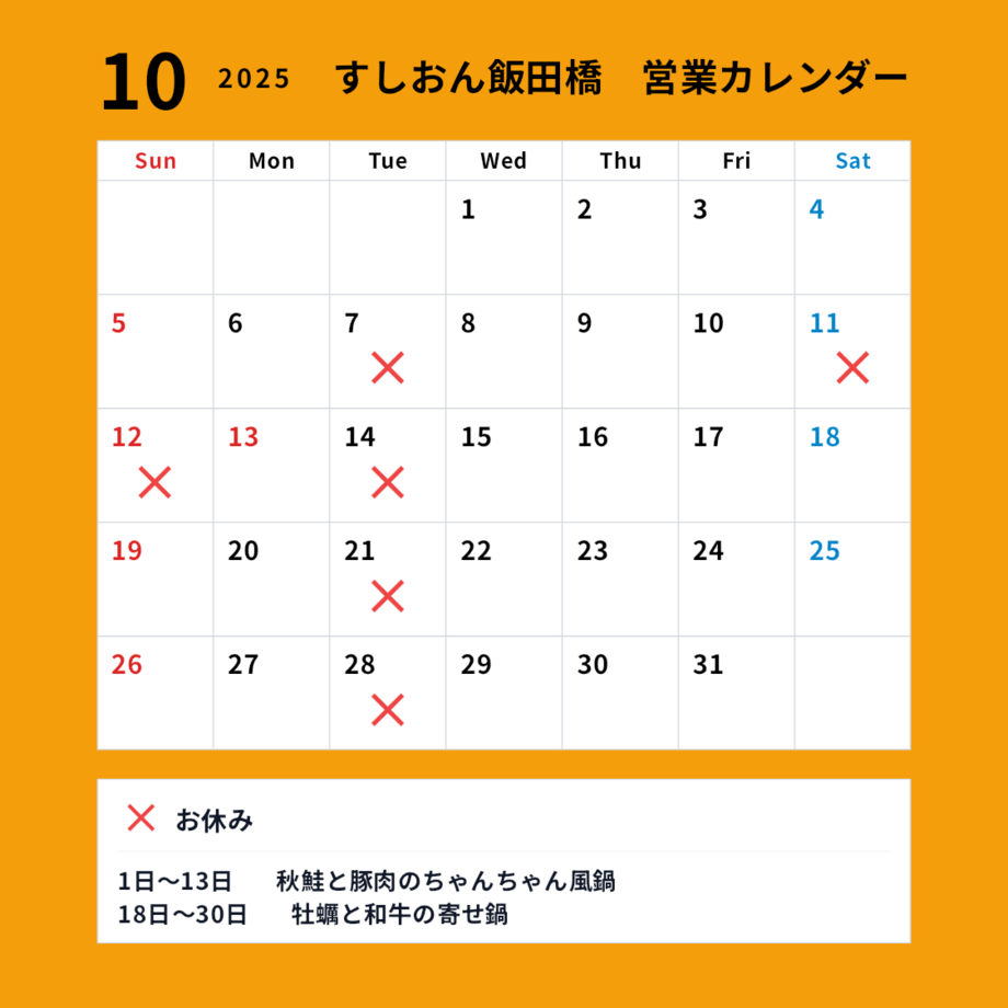 10月の営業カレンダーが出来ましたのでお知らせします。